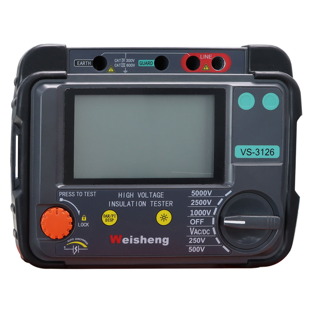 Weshine® VS-3126 یک باتری استتستر عایق ولتاژ بالابا نمایشگر قوس دیجیتال و آنالوگ، طراحی شده برای تست مقاومت عایق ولتاژ بالا در تعمیر و نگهداری و سرویس کابل ها، ماشین آلات کارخانه دوار، ترانسفورماتورها، تابلو برق و کاربردهای صنعتی.